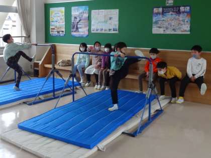 3枚目は、多目的室で、鉄棒運動を楽しむ子供たちの様子です。