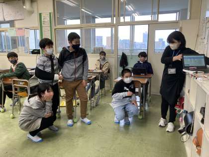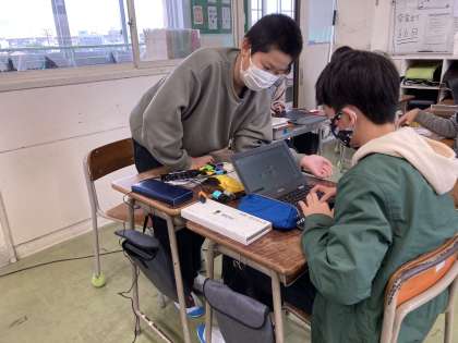クロームブックとMESHを使ってプログラミングの学習しています。人感センサーを利用して光や音を流したり、リモコンを振ったり、向きを変えたりしてプロペラを回す信号を送ったりしました。体験を通してプログラミングは、日時生活でどのように結びついているか確認しました。