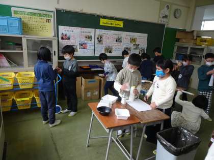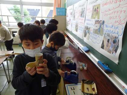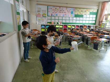 改良が上手くいったかどうか確かめたりたり、作ったおもちゃを使って遊び方を考えたりしました。ストローなどを飛ばすおもちゃは、以前よりも遠くに飛ばせるようになっていました。