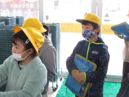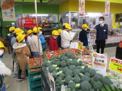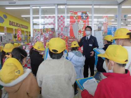 「スーパーマーケットの様々な工夫」を見つけるために、大阪屋ショップ北新町店へ見学に行きました。お店の中は、開店前の準備で忙しそうです。そんな中、店長さんに商品の説明をしてもらったり、質問に答えてもらったりしました。