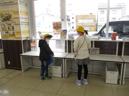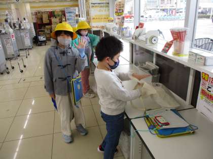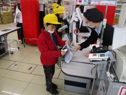 お金と一緒にカードを出している子供もおり、実際の買い物を経験することができました。お釣りとレシートをマイバッグに入れて、おつかい完了です。ちゃんと家で品物を渡すことができたかな?
