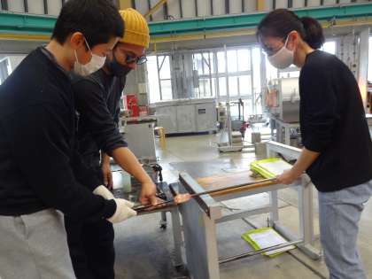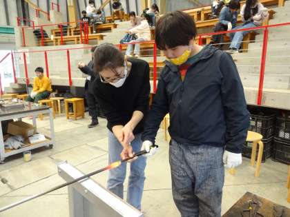 熱いガラスの先をつまんでぐるぐるひねっています。模様が渦巻きのようになり、流れができるのです。