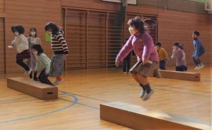 子供たちは、立ち幅跳びの記録を伸ばすための運動メニューに取り組みました。