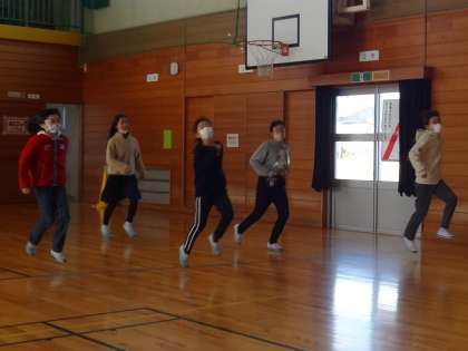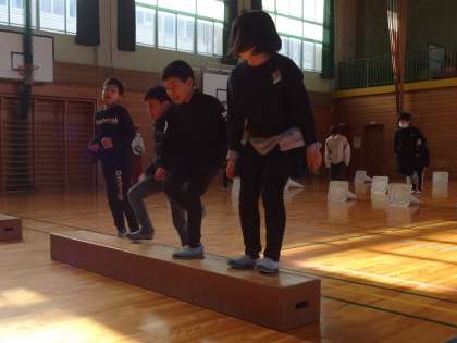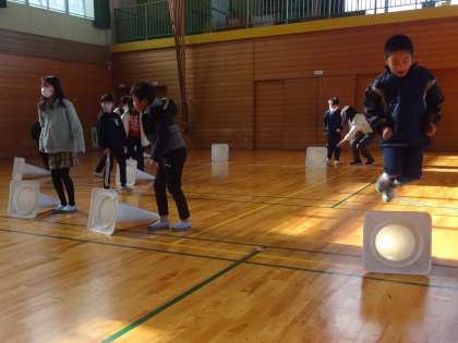 まず、4年生が取り組みました。3種類の運動メニューを順番に行うのですが、2ローテーション目からは、きつく感じるようです。立ち幅跳びの記録向上へつなげていきたいです。