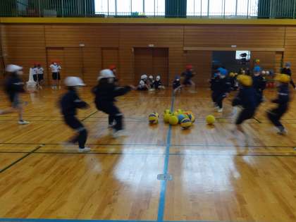 まず、中央に置いてあるボールをみんなで取りに行きます。そして、自分の陣地へ運びました。