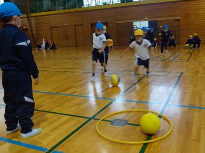 正方形のコートの角に、各色団の陣地があり、フープが置いてあります。そこへ1個でも多くボールを運ぶ競争です。