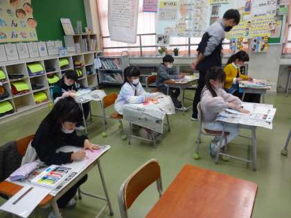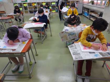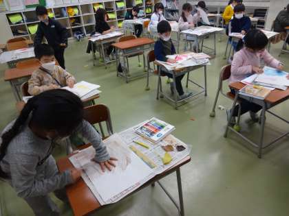 「あきのはっぱと なかよしになろう」の学習課題のとおり、葉っぱを浮き出たせるために夢中になって色を塗り、葉っぱとなかよしになれたようです。