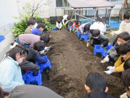球根が居心地よくなるように、やさしく土をいれました。3年生になる頃にはきっときれいな花が咲くことでしょう。