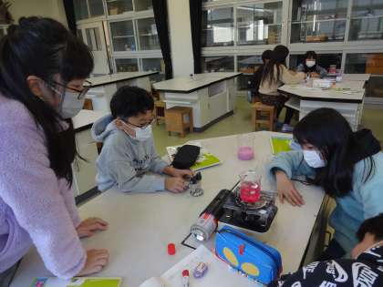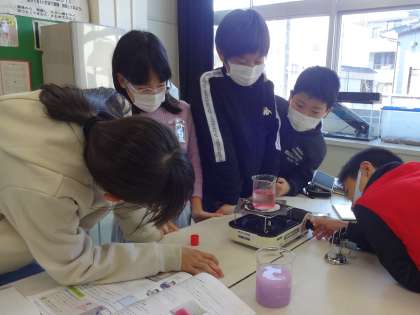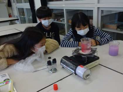 また、ビーカーの底に水彩を入れて、水をあたためると、対流の様子が分かる実験も行いました。(写真)