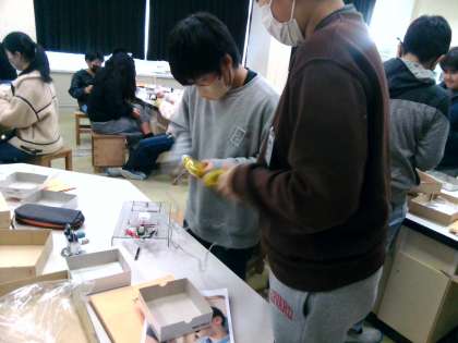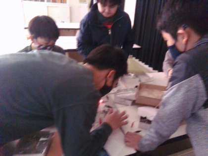 手回し発電機を使って、豆電球や発光ダイオードを発光させたり、モーターを回したりなどしました。ペアで学習して、2人で2つの発電機をモーターにつけて回るスピードを見たり、発電機を逆に回したりして、いろんな条件で実験しました。