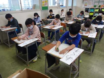 初めて書いたから仕方がありません。子供たちは、手本と見比べて課題を見付け、次へ生かそうとしています。