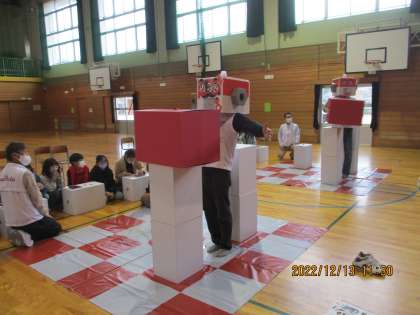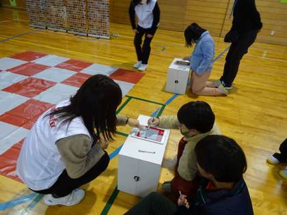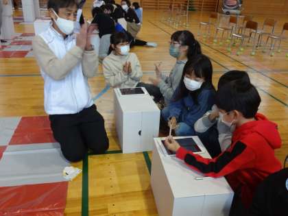子供たちは3班に分かれて、タブレットを用いてロボットを動かすためのプログラミングを作り、試すことができました。実際に指示したとおりにロボットを動かせると、歓声が沸き起こりました。