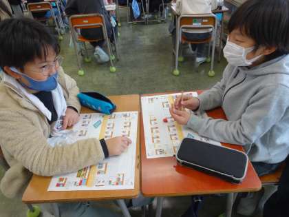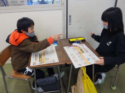 学校内の場所の名前の言い方や、前へ進む・左に曲がる・階段を上るなどの言い方を復習してから、挑戦しました。