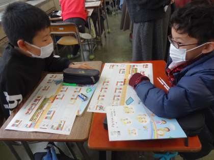 子供たちの手元には、柳町小学校のイラスト見取り図があります。これを使って、自分のお気に入りの場所を友達に案内することが今日の課題でした。