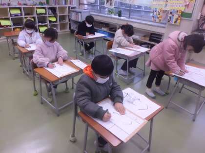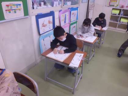 書き初め大会の練習をしています。硬筆で「へいわ」を書きます。