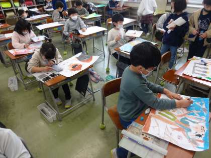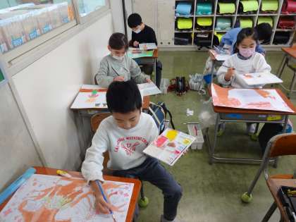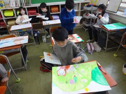「花さかじいいさん」、「かちかち山」、「かさじぞう」の物語の中から、好きな場面を選んで、絵を描いています。物語の様子を思い浮かべながら、楽しく取り組んでいます。