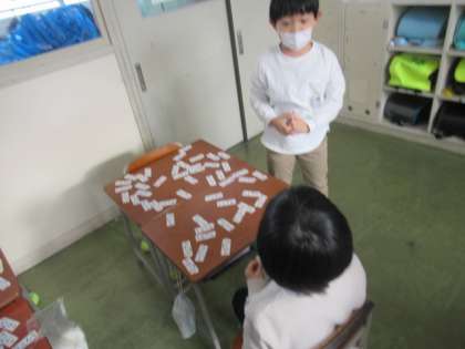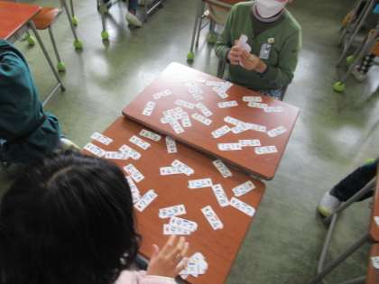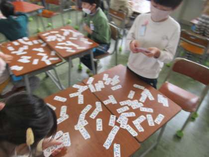 九九の特訓として九九カルタを行いました。先生が言った数字が答えになるカードを相手より先にとると得点になります。