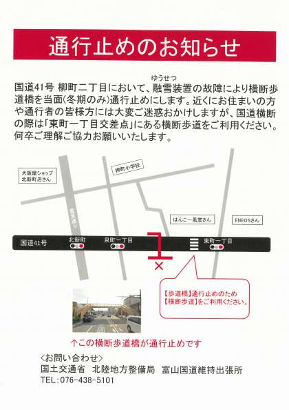 国道41号線柳町二丁目の横断歩道橋が、明日12月23日(金) 9:00から3月末まで、通行止めになります。