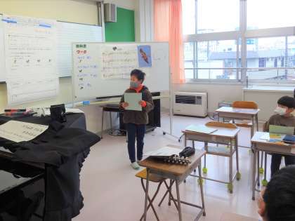 「とんび」の学習では、3段目の「ピンヨロー」を、各自どのようなイメージで歌いたいかを考えて、イメージに合う強弱を表す記号(フォルテ、メゾフォルテ、ピアノ、メゾピアノ)を当てはめました。