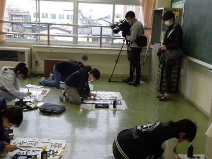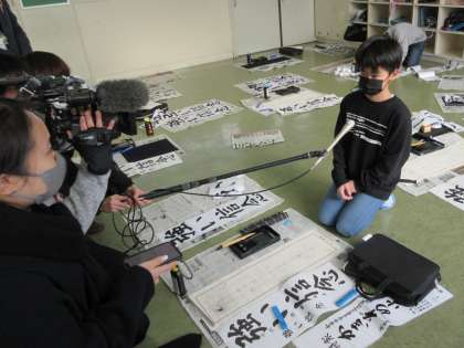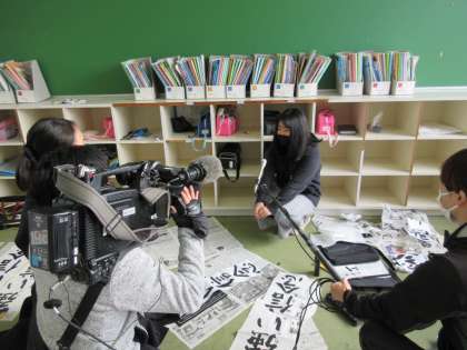 書き初め大会の様子を撮影後、2人がインタビューを受けました。