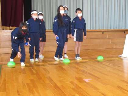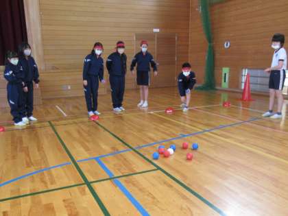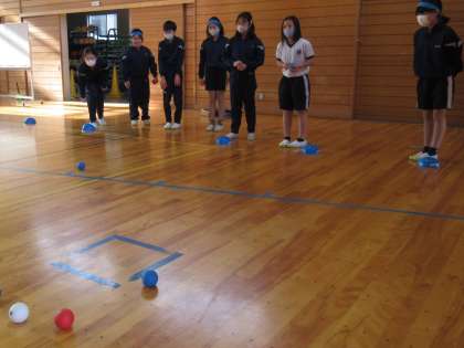 ボールの配置状況を見て、どこに投げるとよいかを考えながら行います。狙ったとおりにいかない子供もいれば、予想以上によい位置に配置できる子供等、一投で戦況が変わるところも面白いです。