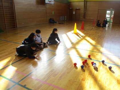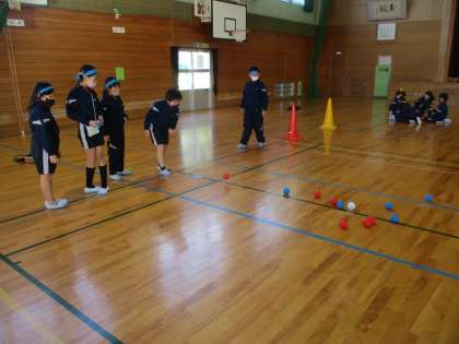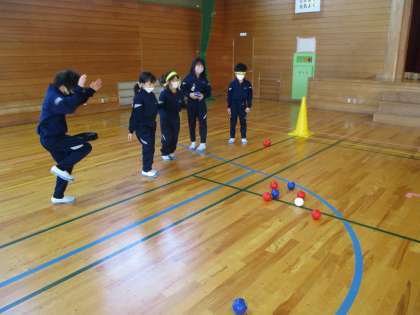 「ボッチャ」に初挑戦しました。子供たちは、コミュニケーションを取りながら楽しくボールを投げ合いました。さすがユニバーサルスポーツ!どんな姿勢、どんな角度からでも楽しむことができました。