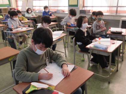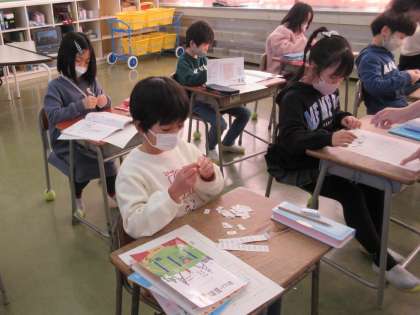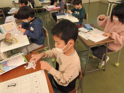 今日は、12月に行った「少人数指導」の方法で授業を進めました。担任と教務主任が分担し、「ぼうけんコース」と「のんびりコース」の2つに分かれました。子供たちは、自分で好きなコースを選びました。