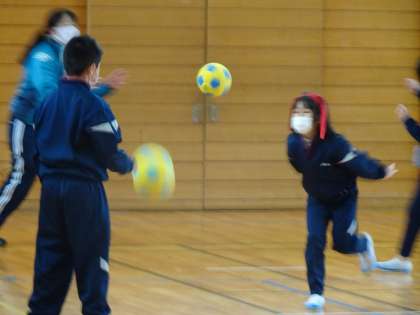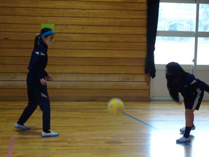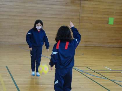 プレルボールとは、こぶしまたは前腕を使い、自陣にワンバウンドさせて味方にパスをしたり、相手が捕りにくいボールを打ち返したりして、得点を競い合う楽しいネット型のゲームのことです。今日は、ボールの扱いに慣れるために、ペアになってワンバウンドさせてボールを打ち合いました。一生懸命に取り組みました。ゲームをできるのが待ち遠しいですね。