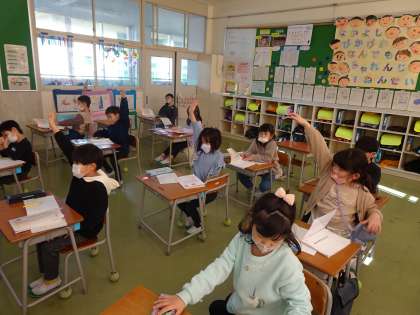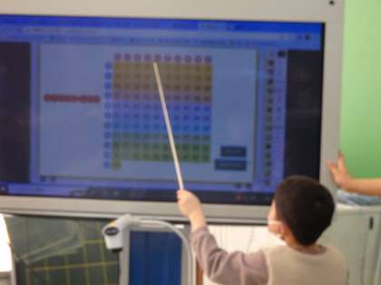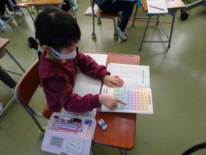 100までの数が並んだ表からどんなことが分かるか考えました。一の位が3の数を見ると10ずつ増えている。十の位が6の数を見ると1ずつ増えているなど、気付いたことを積極的に発表しました。