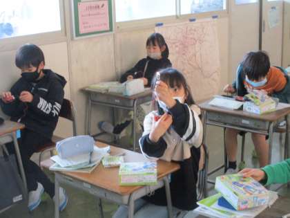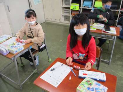 乾電池、ソケット、豆電球を使って明かりをつける実験をしました。豆電球が光ると、思わず「きれい!」「かわいい!」とあちらこちらから声が上がりました。乾電池の向きを逆にしてみたり、導線を交差させてみたりしながら、明かりがつくときと、つかないときの条件を考えました。