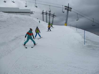 午後の講習が始まりました。中級から上級までの班は、ビスタクワッドリフトに乗り、急な斜面が多いロマンスコースで曲がったり、止まったりする講習を受けました。初心者から初級の班は、初級コースで曲がる講習を受けました。時より晴れ間が見えて、気持ちよく滑ることができました。
