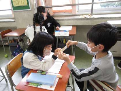 昔の人が手を使って測った方法の「あた」や「つか」は、自分の手ではどのくらいの長さなのか、興味津々で調べました。体験学習を通して、長さの測り方、cmやmmの単位について理解を深めました。