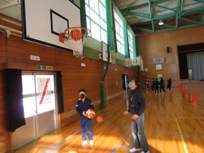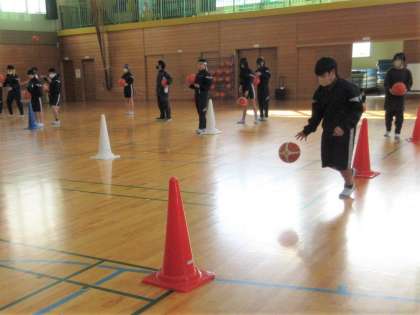 前半は、ジグザグドリブルをしました。ターンする方向によって両手を上手に使うことを学びました。