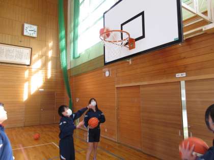 後半は、シュート練習です。どこを狙ったら入りやすいか試し、最後には、チームでシュート数を競争しました。1人1分ずつシュートをして、全員のシュート数を合計しました。競争すると、運動意欲が高まります。