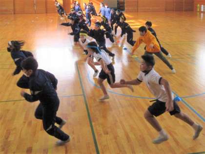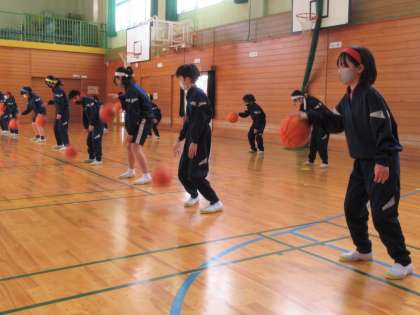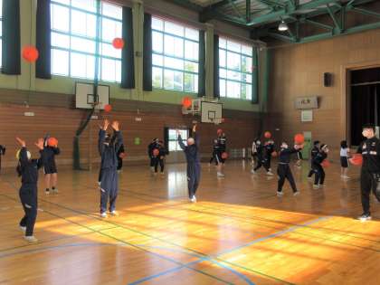 プロバスケットボールチームの富山グラウジーズから3名のコーチが来校し、バスケットボールを指導していただきました。