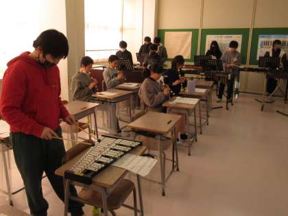 6年生が、合奏練習をしています。校歌を歌うことはありますが、音楽室にある楽器を使って合奏することは、めずらしいことです。