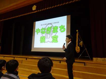 次に、PTA福田会長さんが、「やなぎまち検定」をしてくださいました。5つの問題を出しながら、柳町小学校の歴史を詳しく説明していただき、楽しく過ごすことができました。