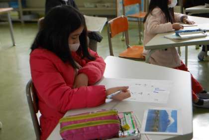 まず、周りを見渡したり写真を手がかりにしたりしながら、音読みや訓読みの言葉を集めることから始めました。いくつか集まったら、さあ、文づくりの開始です。難しいけれど頑張りました。