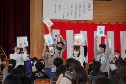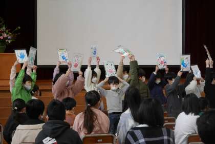 そして、タイムカプセルに入れる、20年後の自分に向けて書いたメッセージ(手形入り)を披露しました。