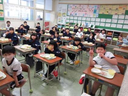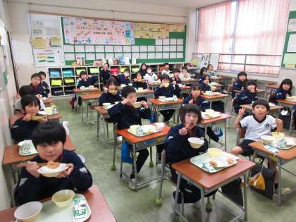 写真は2年生教室の様子です。「おいしい」と言って笑顔で食べています。