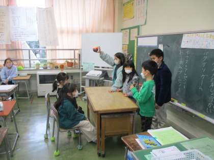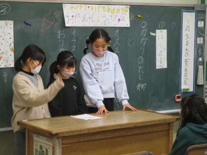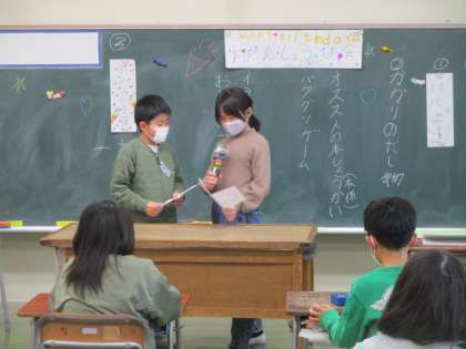 1月生まれのお友達の誕生会をしました。みんなで楽しもうと、係ごとに工夫を凝らして出し物を考えました。手作りのマイクがすてきです!