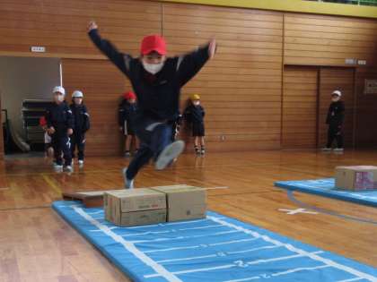 段ボール箱を障害物として置き、ジャンプする運動に取り組みました。