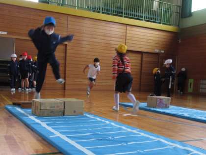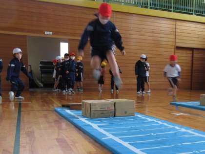 子供たちは、夢中になって何度も何度も飛び越しました。「高く」を意識する子供、「遠く」を意識する子供など様々ですが、障害物を飛び越える動きが楽しいようです。