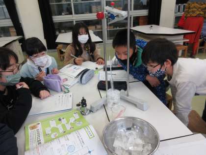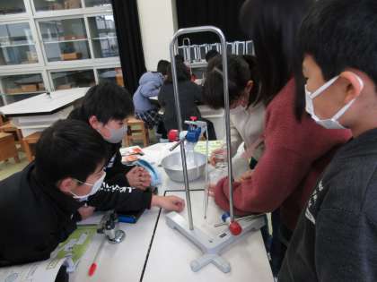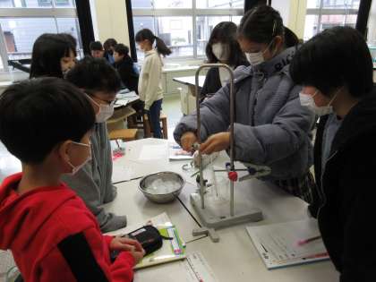 協力して実験準備をした後、計時しながら真剣に観察しました。