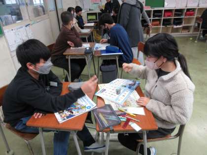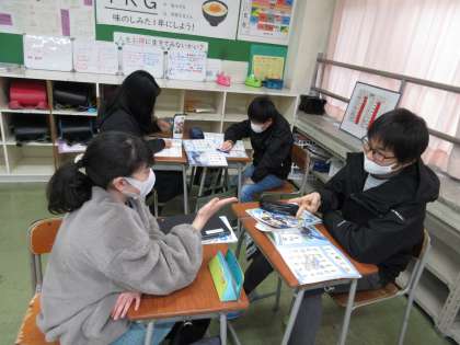 また、教科書に載っている動作の絵を活用して、英会話を入れた双六をしました。じゃんけんをして、グーで勝ったら1ます進みます。チョキは2ます、パーは3ますです。