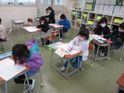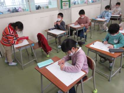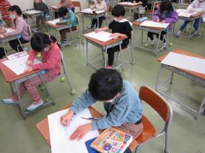 紙版画の製作を始めました。今日は、下絵を描きました。題材名は、「自分がしていて楽しいこと(学校で)」です。