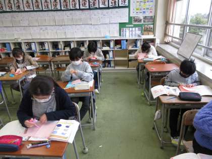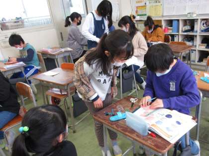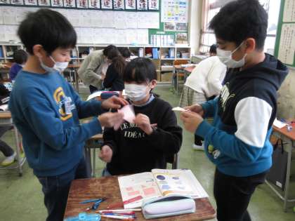 多角形と円を詳しく調べるために、作業してる様子です。困ったときは、友達同士で教え合う姿が見られました。