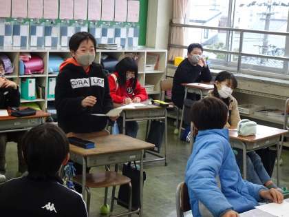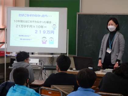 富山市保健所から講師を招いて、たばこの健康被害について学びました。体に害がある物質が200種類以上含まれていること、その中でも「タール」「一酸化炭素」「ニコチン」の3つが特に体への害が大きいことを知りました。クイズ形式で学んだこともあって、楽しく学べました。