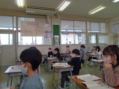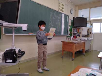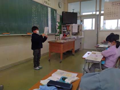 「たぬきの糸車」の学習で、物語のすきなところを選んで、絵と文で伝えるカードをつくりました。今回は、すきなところの文を工夫して音読し、発表しました。声の大きさや抑揚を意識して、不思議そうに読んだり、嬉しそうに読んだり、絵の様子が伝わるように音読しました。
