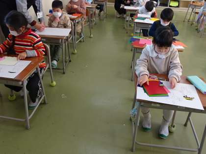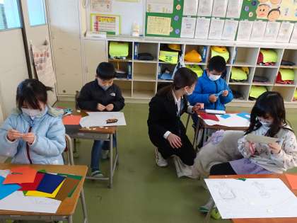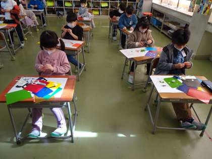 シールを細かく切って、貼り合わせることで版画に色を付けています。どんな色にするか、どれくらいの大きさに切るかを考えながら、作業を黙々と進めました。